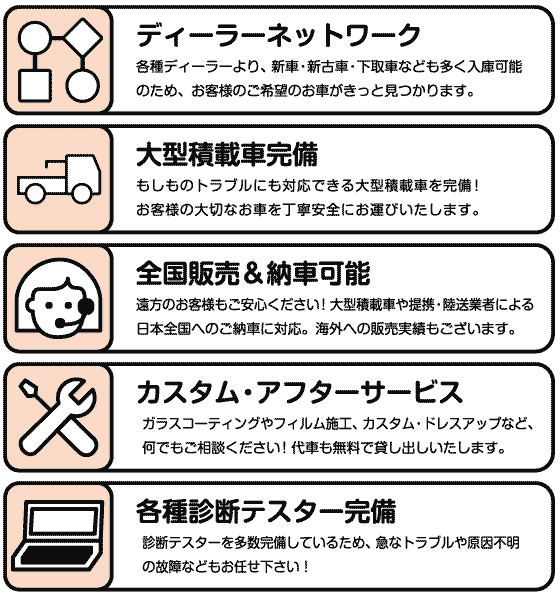 「安心して中古車に乗ってほしい」という想いから、5つのサービスを用意しています。